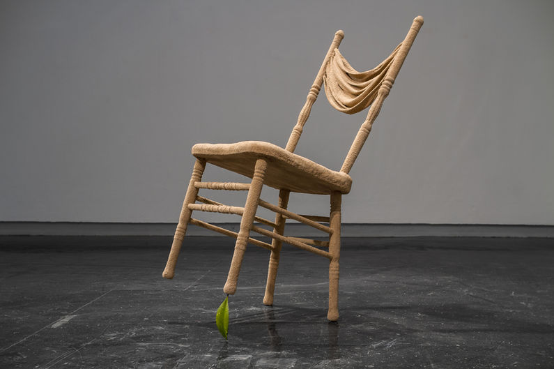 Artist's description: "Sand chair precariously balancing on the tip of a wet wooden leaf. First exhibited at the Anderson Gallery with “Warmth”. The idea for this piece comes from thinking about the “home” as a precarious place. A place of balance, stability and how if one doesn’t take care of it, it can fall apart. I used the chair as a symbol of home space, and its made out of sand because sand is malleable as the idea of the home is as well, yet it can crumble in a matter of seconds. As an immigrant in the USA, I’ve built my “home” here but it can be destroyed if I get deported or my family is. The leaf balancing this chair represents the idea of the care something like a friendship, relationship or emotion needs in order to keep it alive. Like watering your plants."